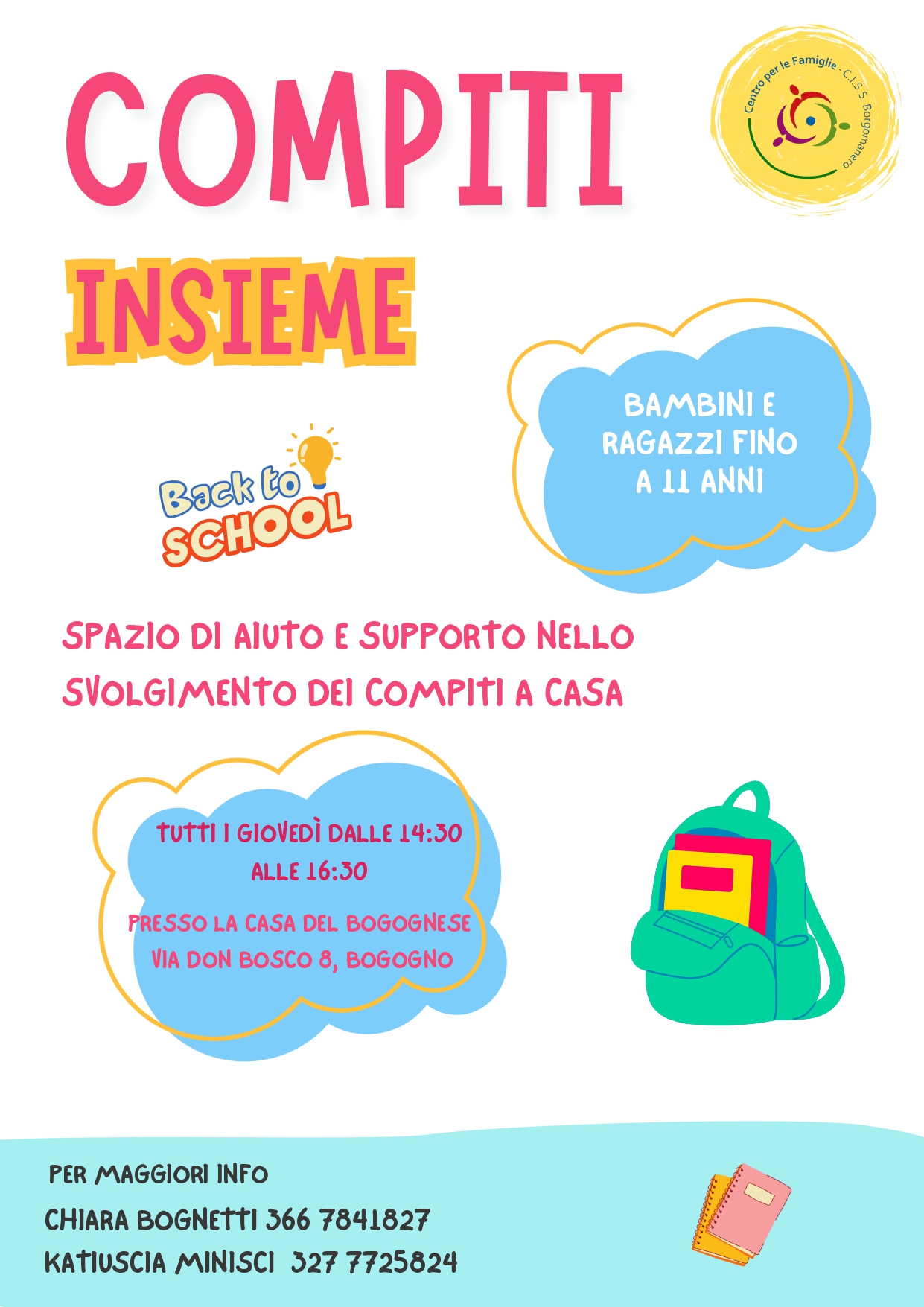 Centro per le famiglie - CISS Borgomanero organizza tutti i giovedì, dalle ore 14.30 alle 16.30 presso la Casa del Bogognese una spazio di aiuto e supporto nello svolgimento dei compiti a casa per bambini e ragazzi fino a 11 anni.