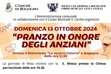 Domenica 13 ottobre si svolgerà il Pranzo in onore degli anziani, presso il Ristorante La nostra osteria. Prenotazioni entro il 5 ottobre.